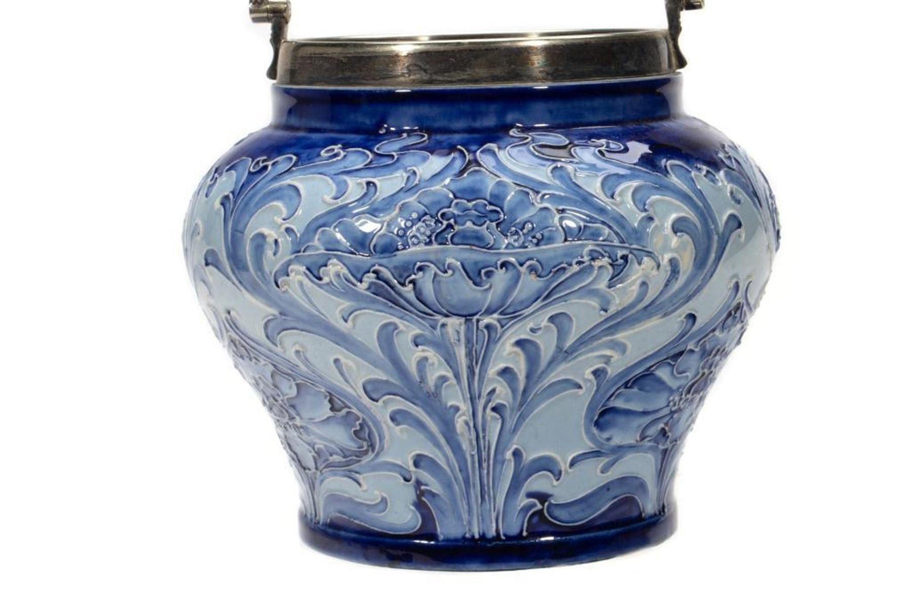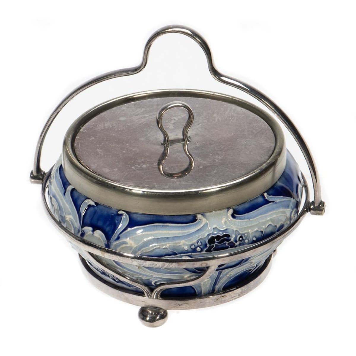 Two Florian Ware Tulip decorated bowls with Plated frame and lid Greatest height 5 1/2in (14cm) Condition: Largest lacking lid