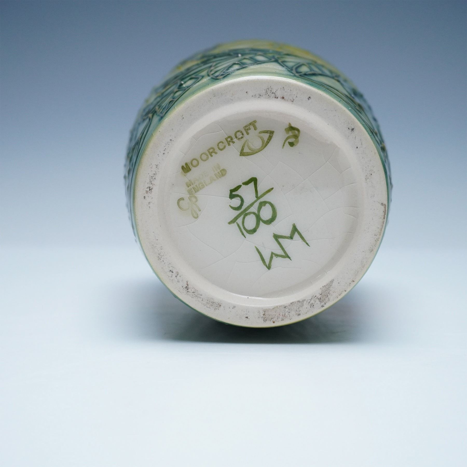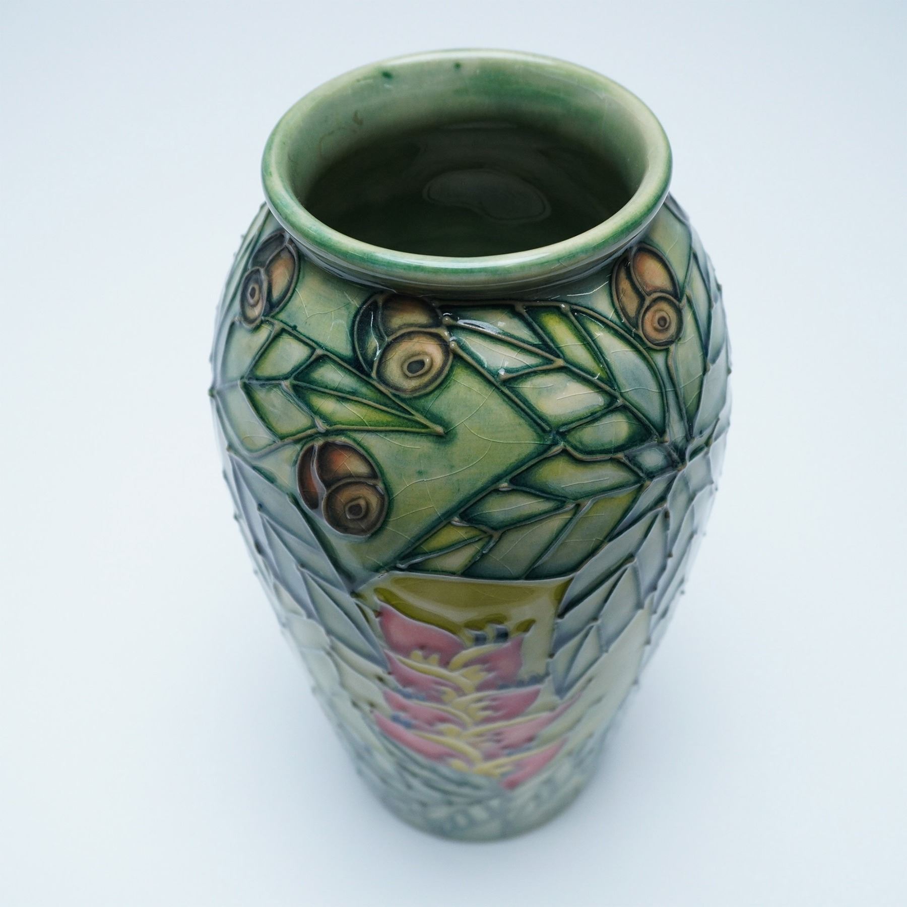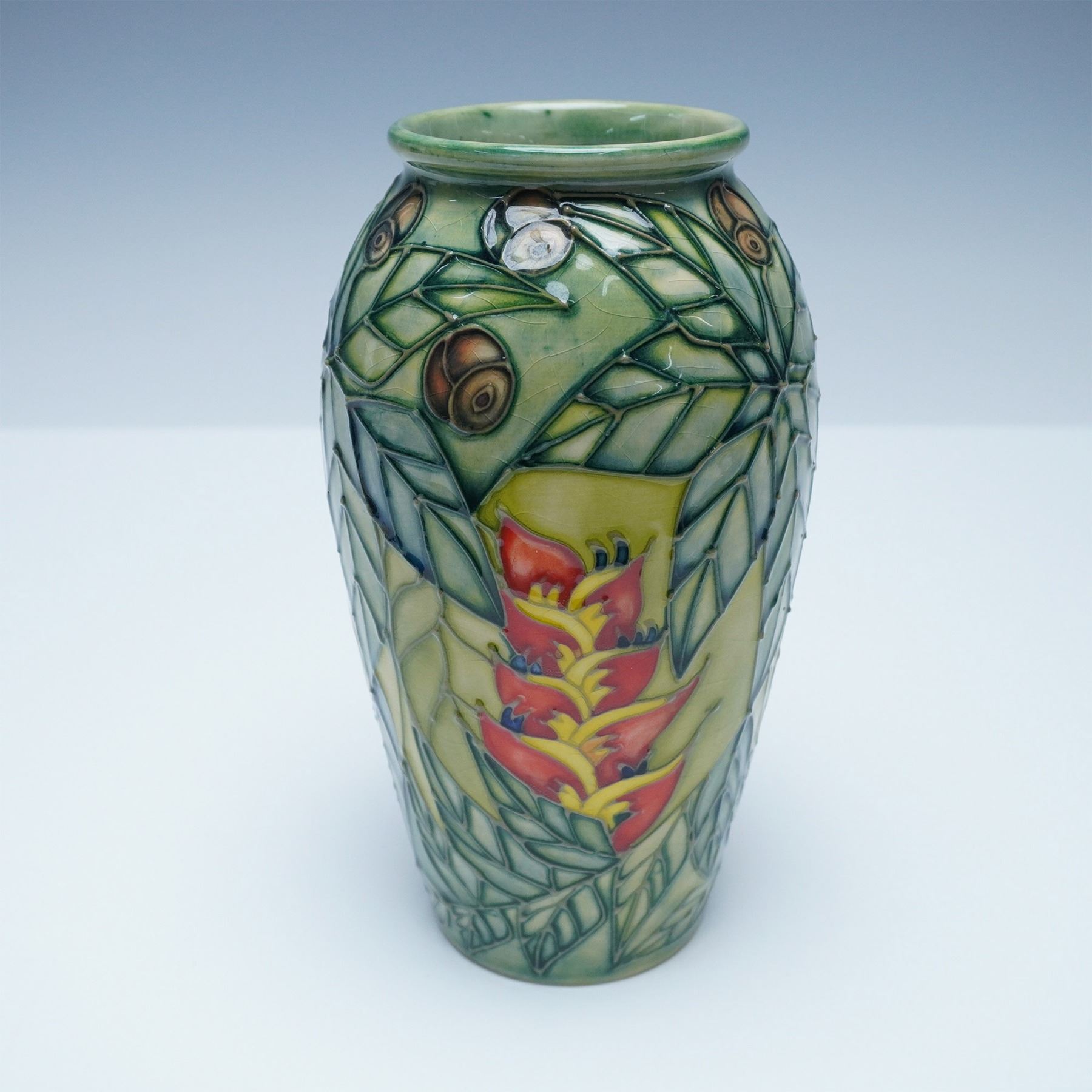 A striking Moorcroft pottery vase featuring the 'Rainforest' pattern, a lush tropical-inspired design adorned with detailed foliage, snails, and florals, executed in the brand’s signature tube lined technique. The vase is finished in an earthy palette of greens, yellows, and purples, adding depth and vibrancy to the piece. This limited edition vase is numbered 57 of 100, marked on the base with the Moorcroft stamp.