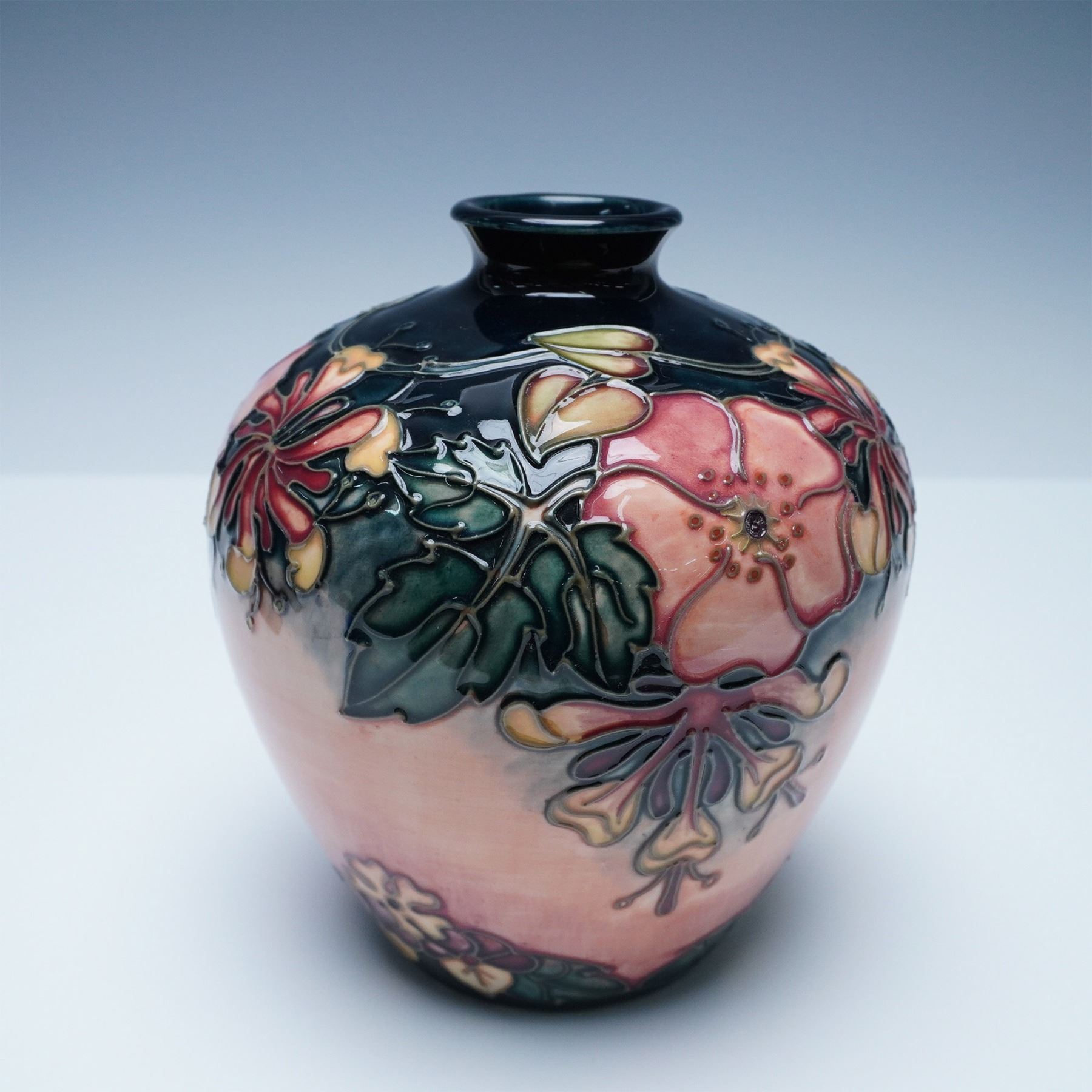 This exquisite Moorcroft pottery vase features the 'Oberon' pattern, a design by renowned artist Rachel Bishop. The vase showcases a squat, swollen form with a gracefully shaped collar, adorned with intricate floral motifs in harmonious tones of pink, yellow, and green set against a deep blue background. The piece is marked on the base with impressed and painted Moorcroft marks, including the date 1993. This item has its original box.