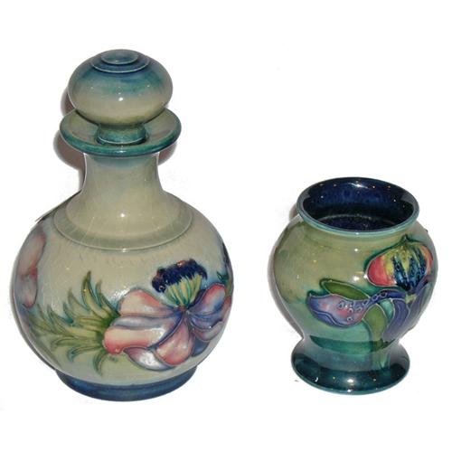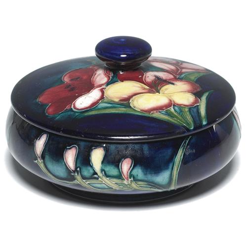 Moorcroft box, round form in blue with floral design, 5"w; with a Moorcroft vase, (not shown), footed form in green and blue with orchid design, 3.25"h; with a Moorcroft bottle, (not shown), bulbous form in ivory with poppy design, all signed, 6"h