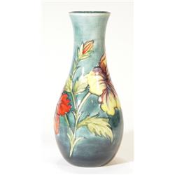 Moorcroft pottery vase, hand painted and tubelined with frilled orchids onto a blue ground, impressed marks, paper label and signature to base, 28cm high
