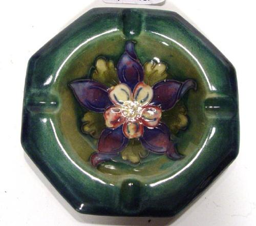 Moorcroft triangular ashtray, hand painted and tubelined with hibiscus pattern onto a green ground,