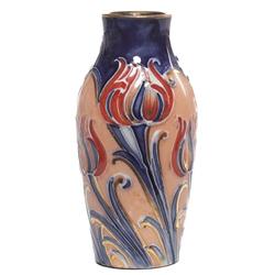 Moorcroft vase, miniature form with Poppy design in blue, orange, pink and gold, designed by Macintyre, marked, 3”h