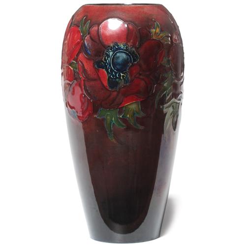 Moorcroft vase, tapered form in red with poppy design, signed, 7"h; with a Moorcroft jardinière, (not shown), large form in red with tree designs, signed, 10.5"h, hole in base, several cracks throughout