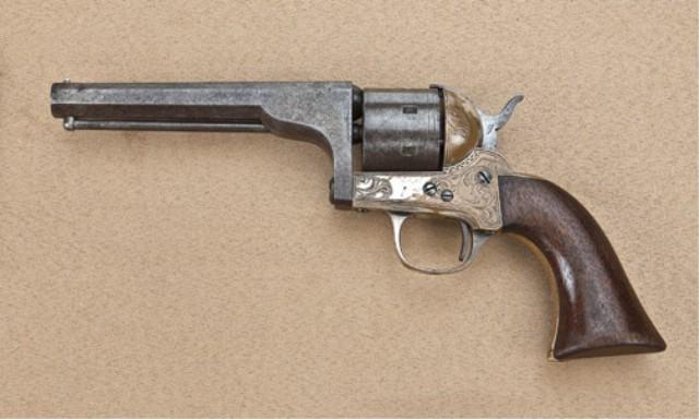 Moore 7-shot .32 caliber rimfire side-swing revolver, brown patina finish, with traces of silver on engraved brass frame, wood grips, serial #5753, with 5” barrel. The barrel and cylinder shows traces of blue drifting to a brown patina, some scattered erosion and pinprick pitting, light patent dates visible on cylinder. Frame triggerguard and backstrap show 10% silver plate drifted to a honey color brass patina. The grips show 30-40% varnish and are good, with some even wear, good action, good interior, generally good overall. Est: $400 - $800