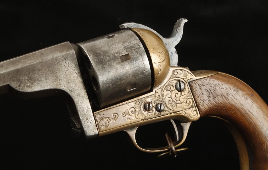 Single action open top 7 shot revolver made in the early 1860's with 4" octagon barrel. Brass frame with scroll engraving, smooth square butt walnut grips and bead front sight. Barrel and cylinder swing to right for loading. Popular among Union officers during the Civil War. Metal museum tag #717 still attached. Very good working action. Condition: Good to very good original condition showing traces of original silver plating on frame and traces of original bluing on barrel and cylinder. Ejector rod is missing. Grips are very good showing no loss. *Antique Firearm*