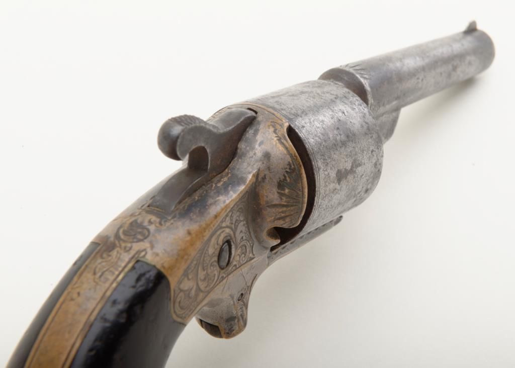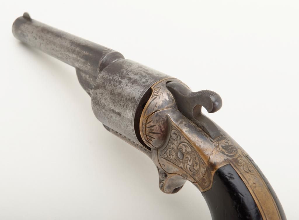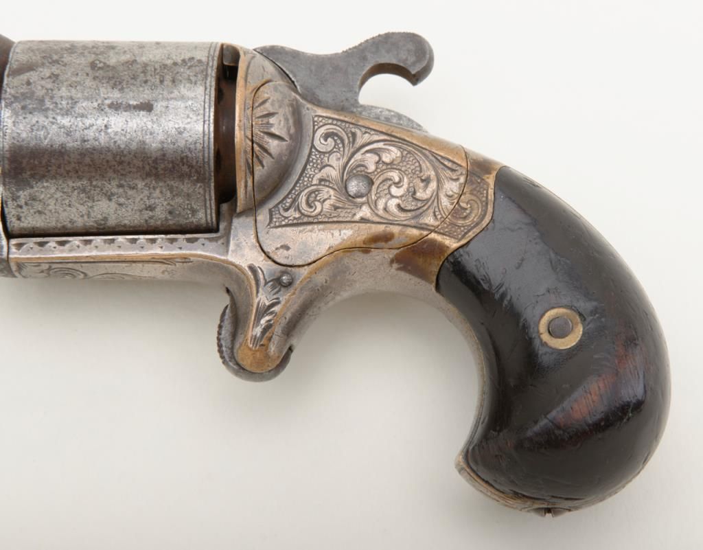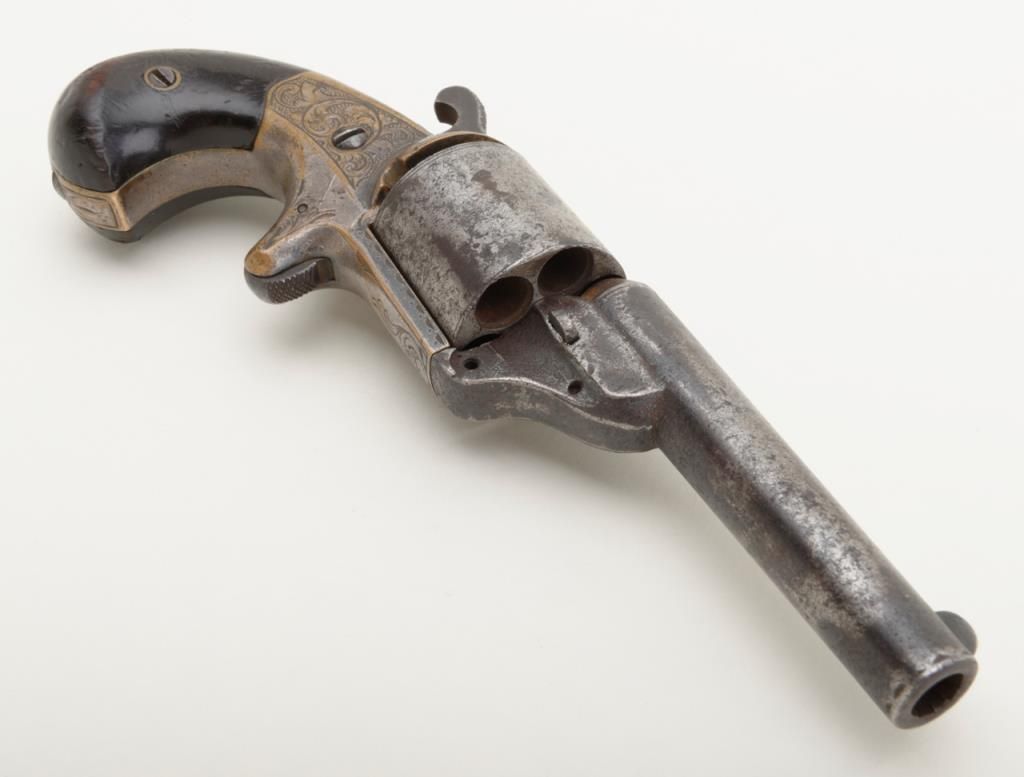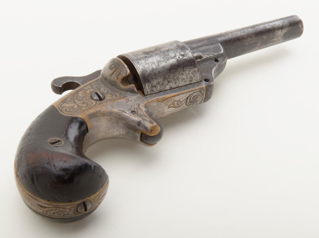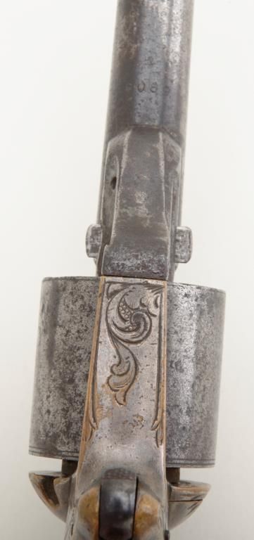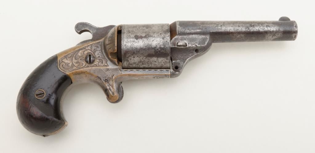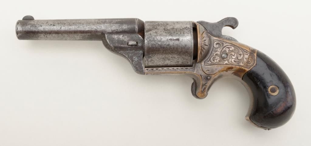 Moore open top spur trigger revolver, .32 teat fire cal., 3-1/4” barrel, engraved brass frame, wood grips, #8089 in overall good condition showing a dark patina on barrel assembly and cylinder with traces of silver wash on frame; good action, fair bore and grips. (Antique). Est.: $250-$500.