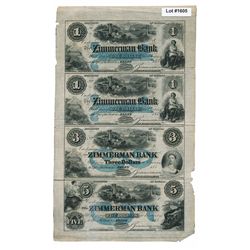 THE ZIMMERMAN BANK. $1.00, $1.00, $3.00, $5.00. 1855-(1854-59). CH-815-12-08-02R, 02R, 04R, 06R. An uncut sheet of Remainders. Large margins. Blue laz