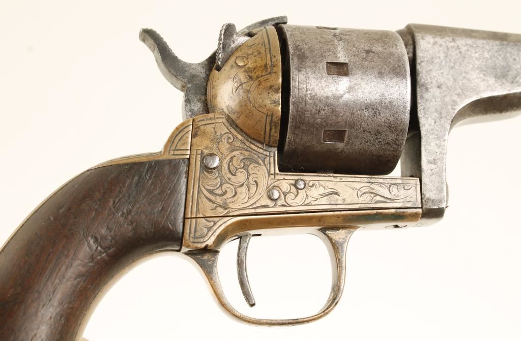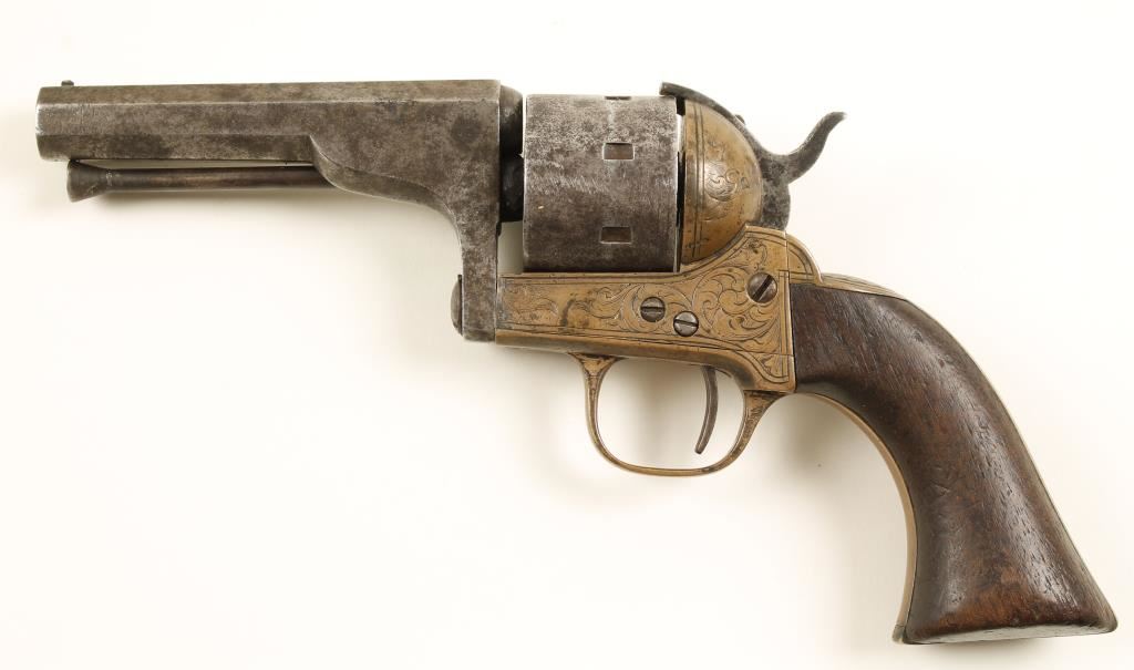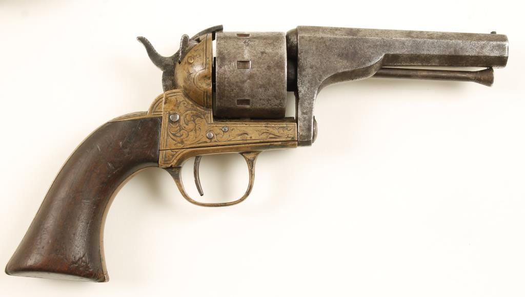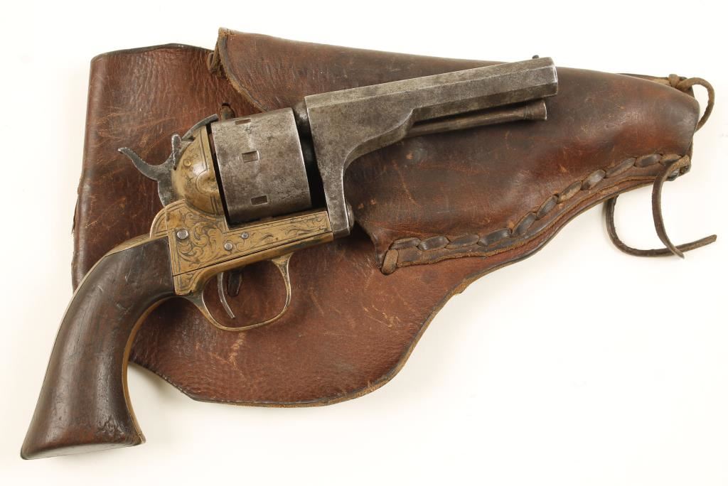 SN: 8021 Blued and brass single-action 7-shot open top revolver with a 3-3/4"octagon barrel. Finish is a grey patina with pitting and rust stains. Roll-stamped "Manufd for Smith & Wesson by Moore's Pat. Fire Arms Co.". Bore has rifling and pitting, and chambers are rough with pitting. Brass frame, trigger guard and backstrap have extensive engraving in good condition. Action works but the timing of rotation is off. Wood grip has shrunk with extensive wear, dings and scratches. Includes a homemade leather holster with leather thong stitching. Condition is poor to fair. *Antique Firearm*