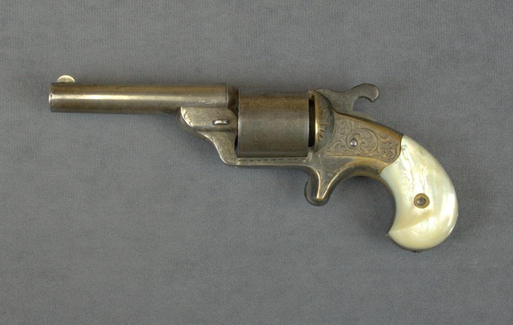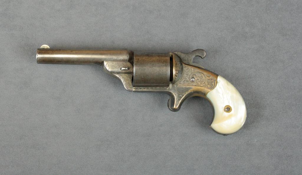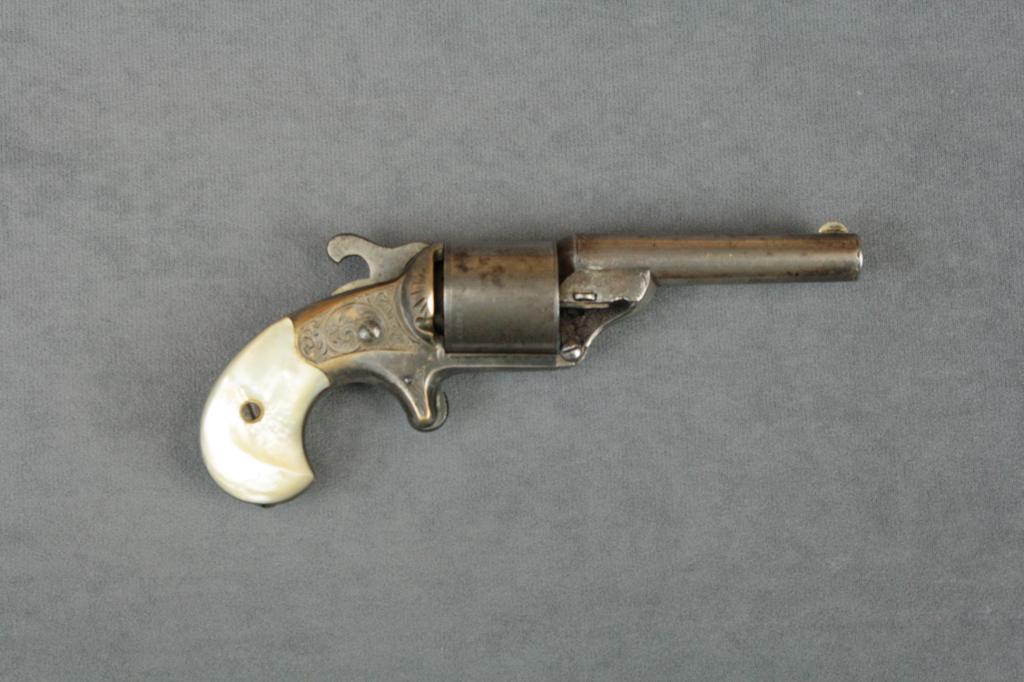 Moore’s Patent Firearms Co. spur trigger revolver, .31 cal., 3-1/4” barrel, blue and silver washed finish, engraved brass frame, pearl grips, #6844. This gun is in overall very good to fine condition showing an evengrey patina on the barrel assembly, approx. 30% original silver wash on the frame in protected areas, good action and markings, dark bore, outstanding thick iridescent pearl grips that fit this gun impeccably. Est.:$600-$1,200.