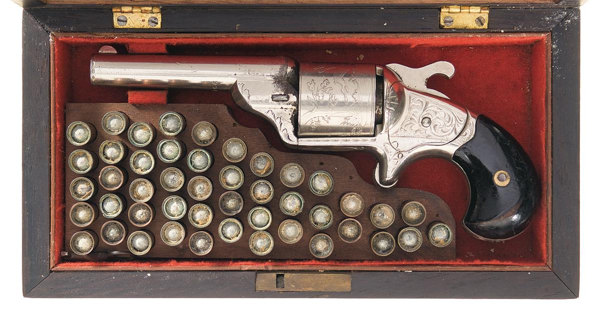 Made from 1864 to 1870. Blade front and hammer notch rear sights, with "MOORE'S PAT. FIRE ARMS CO. BROOKLYN, N.Y." marked on top of the barrel and "D. WILLIAMSON'S PATENT JANUARY 5, 1864" on the rear of the cylinder. The cylinder is deeply acid etched, with a scene of a stag running through the woods on one half and an American Eagle with "E. PLURIBUS UNUM" banner on the other half. Scroll and punch dot engraved frame, with wavy border lines under the cylinder and burst patterns on the recoil shield. Smooth bird's head walnut grips. In a hardwood case with inlaid brass plate in the lid, red felt lining, 46-round cartridge block, 46 teatfire rounds and a paper label reading "Lieut. Kerry Sandes" in script.