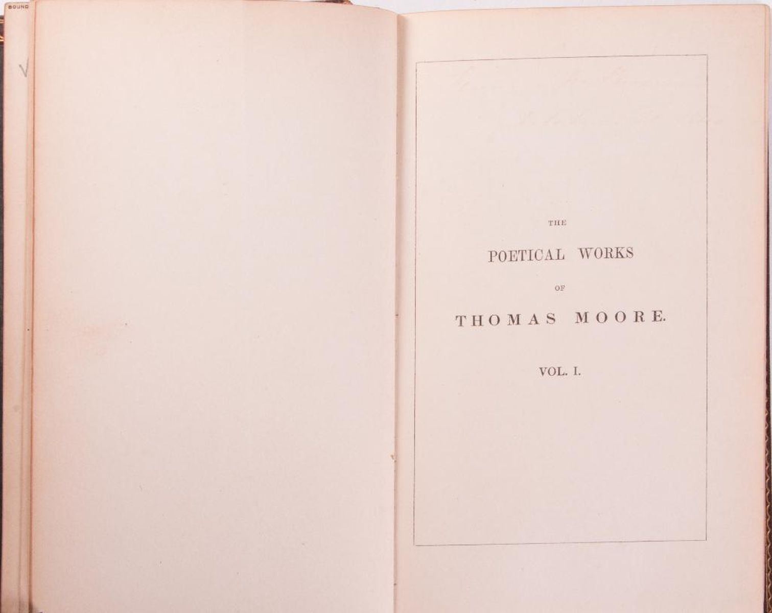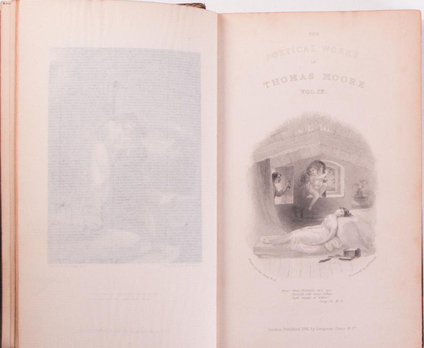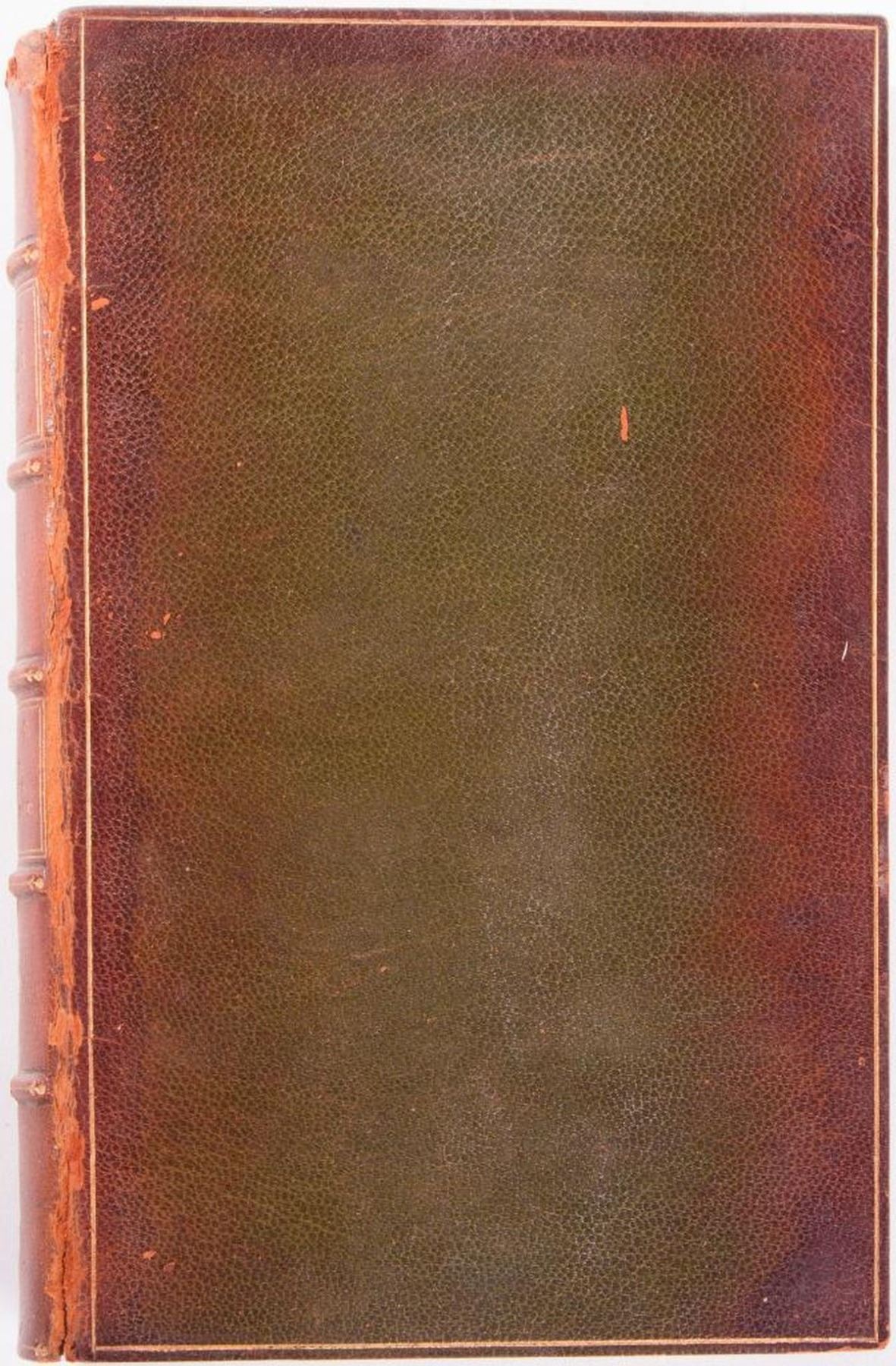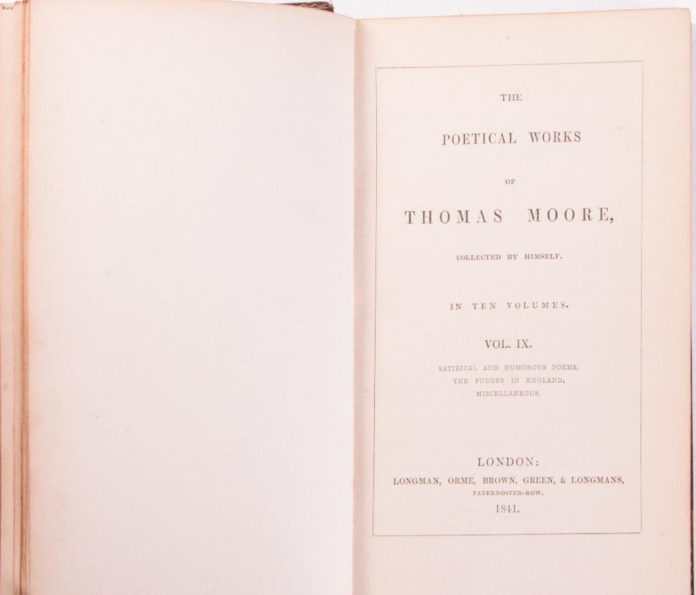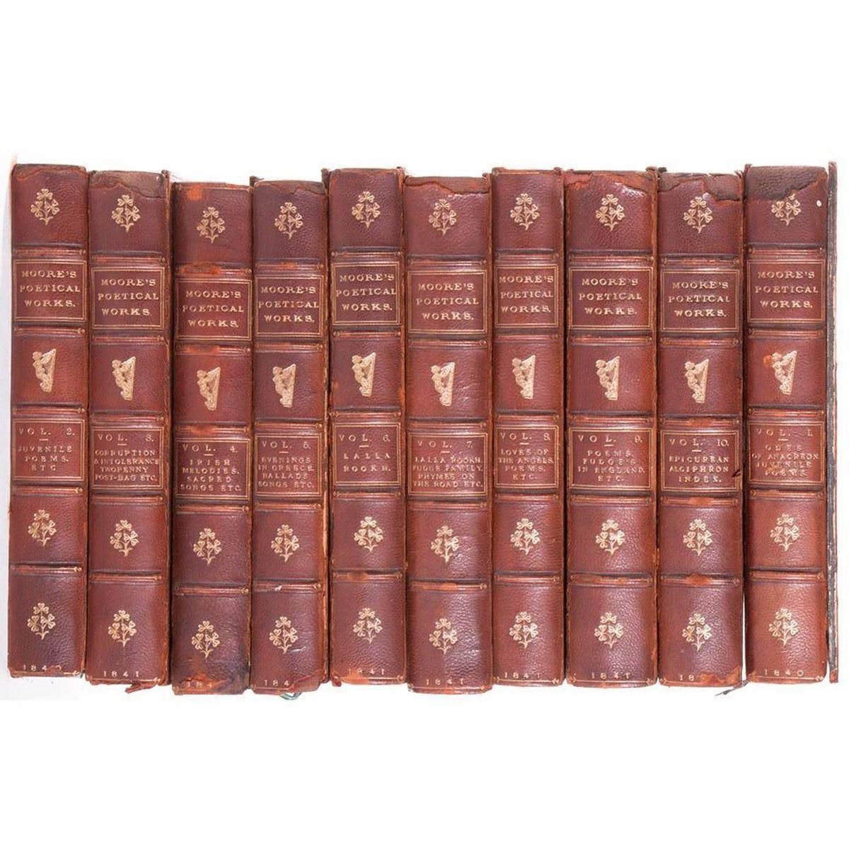 Title: Moore€™s Poetical Works Author: Thomas Moore Place: London Publisher: Longman, Orme, Brown, Green, & Longmans Date: 1840 Description: Ten volumes, calf leather. Raised bands with the title blocked direct in gilt. Each volume has engraved frontispiece. Each volume has additional engraved title page with engraved vignette. Condition: Fair- Good condition. General wear to leather. Five front cover boards have separated completely from spine.