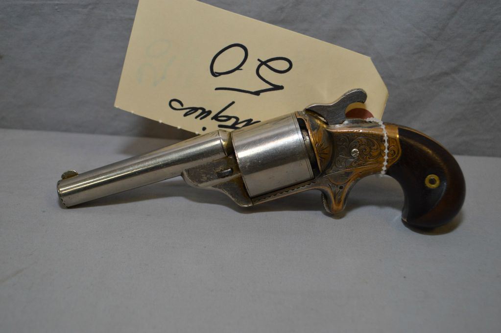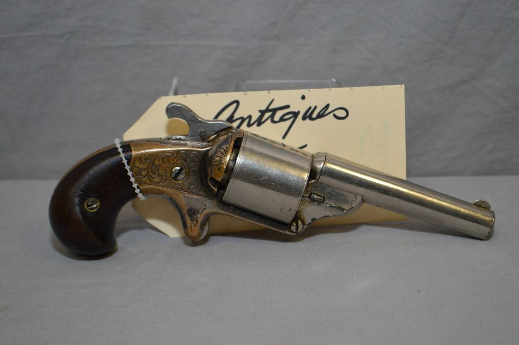 Moore's ( Williamson's Patent ) Model Front Loading .32 Teatfire Cal 6 Shot Revolver w/ 3 1/4" bbl [ special cartridge designed by David Moore & David Williamson, engraved brass frame, some silver plate showing, rosewood bird's head grips, spur trigger, nickel finished barrel & cylinder, marked on cylinder "D. Williamson's Patent Jan.5, 1864", barrel markings "Moore's Patent Firearms Co. Brooklyn New York", without hook extractor, has small hinge swivel gate on right side of the barrel lug, ahead of cylinder, Production Quantity Approx. 20,000 Circa 1864 - 1870 ] Ser # 2647 ANTIQUE NO PAL REQ