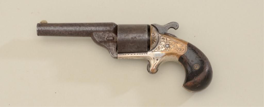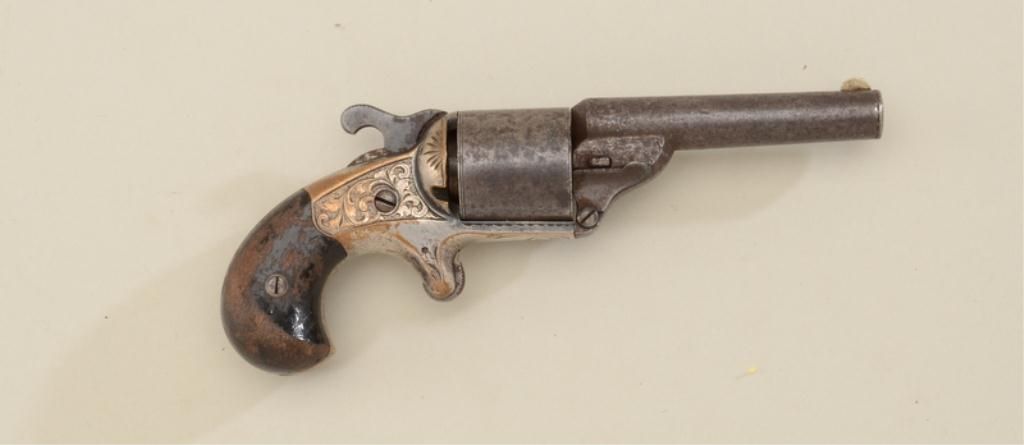 Moore teat fire spur trigger revolver, .32 cal., 3-1/4” barrel, engraved brass frame with traces of silver plating remaining in protected areas, wood grips, #6317. This gun is in overall good condition showing a darkpatina on barrel and cylinder with scattered erosion; dark bore, action working but doesn’t stay on full cock, worn grips. Est.: $300-$600.