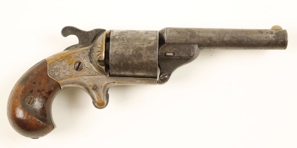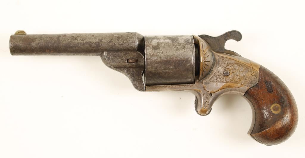 Blued single-action brass-framed spur-triggered 6-shot revolver with a 3-1/4" barrel. Light engraving on the barrel and extensive engraving on the frame. Bluing has faded to a patina with pitting and surface rust. Plating covers approx. 35% of the frame and what remains is dull. The wood grips have dings and rubs. Action is missing hammer and trigger springs. Bore has pitting and good rifling. Chambers have a little rust. Condition is poor to fair. *Antique Firearm*