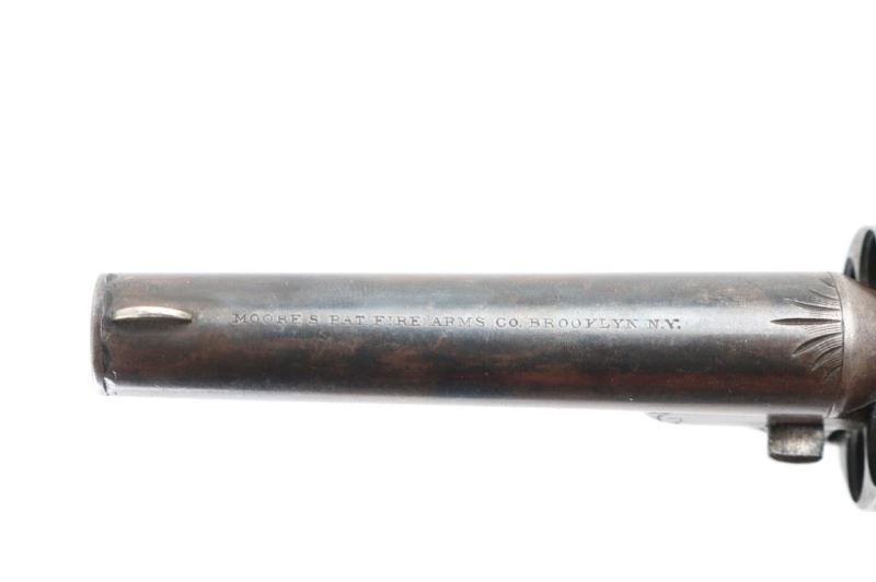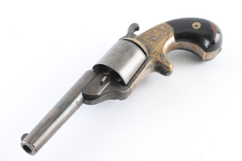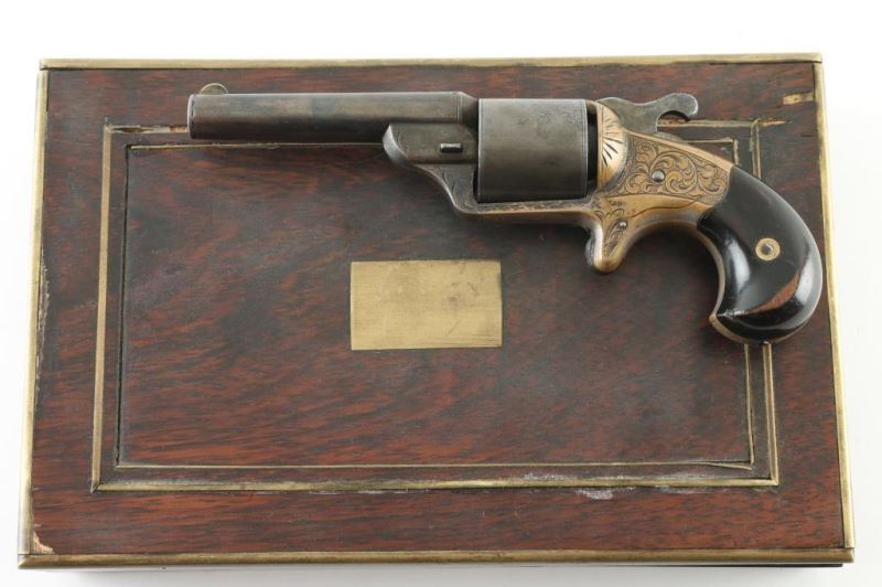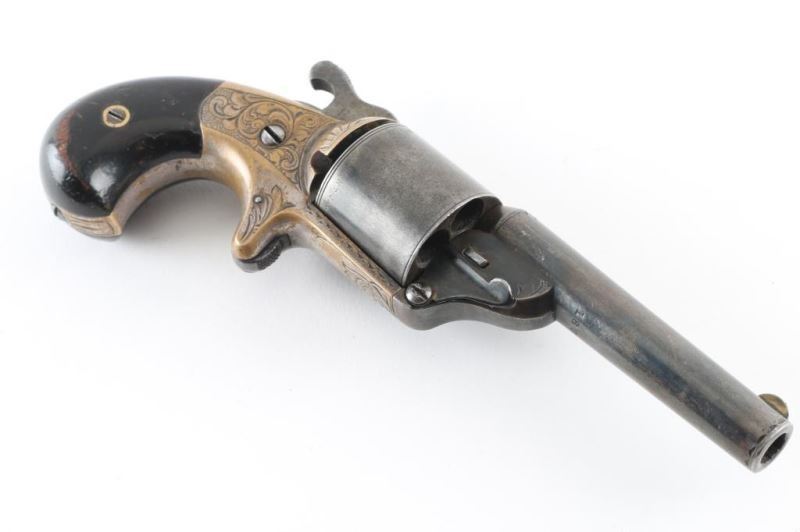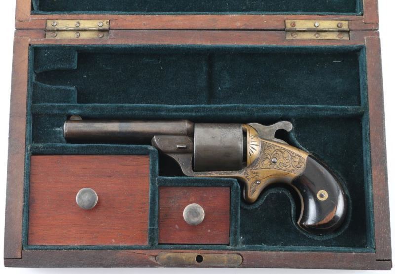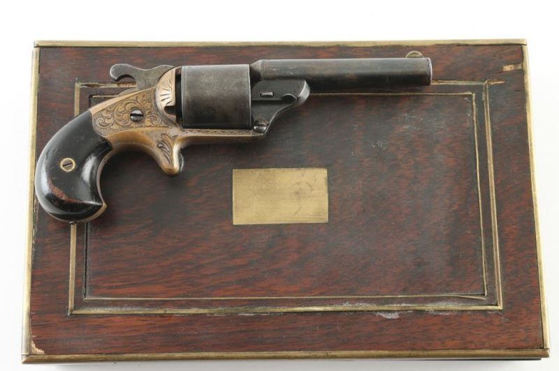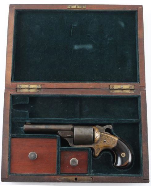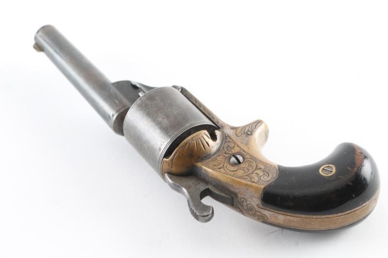 French style revolver with fitted walnut and brass inlaid case. 3.25" round barrel, unfluted 6 shot cylinder, floral scroll engraving on brass frame. Considerable original drifting blue finish now showing as mottled grays. Grips are good, with some finish loss. Mellow patina on the brass frame with traces of silver. The rosewood veneer case is very good with some damage to the lid and minor warpage, missing brass escutcheon for key slot. The lining is very good and unusual raised slotted pedestal above the pistol for an unidentified item possibly a rolled scroll or document. Two lidded compartments with brass pulls. Condition is NRA Good *** Antique Firearm ***