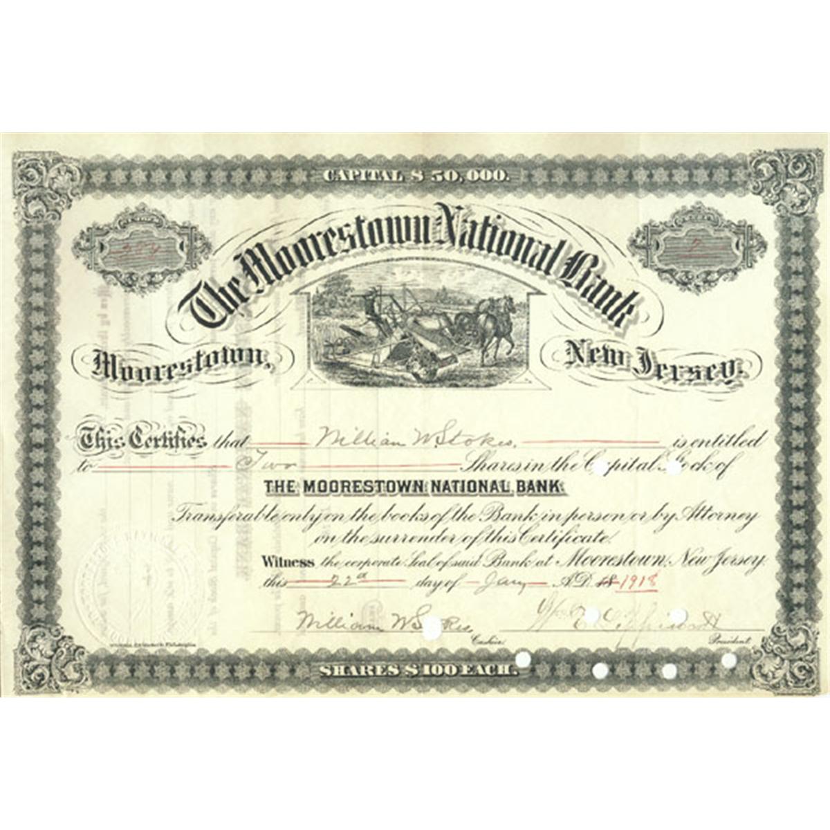 1918, New Jersey. Stock certificate for 2 shares. Black. Vignette at top center of farmer, plow and horses. Lightly punch cancelled. Very fine.