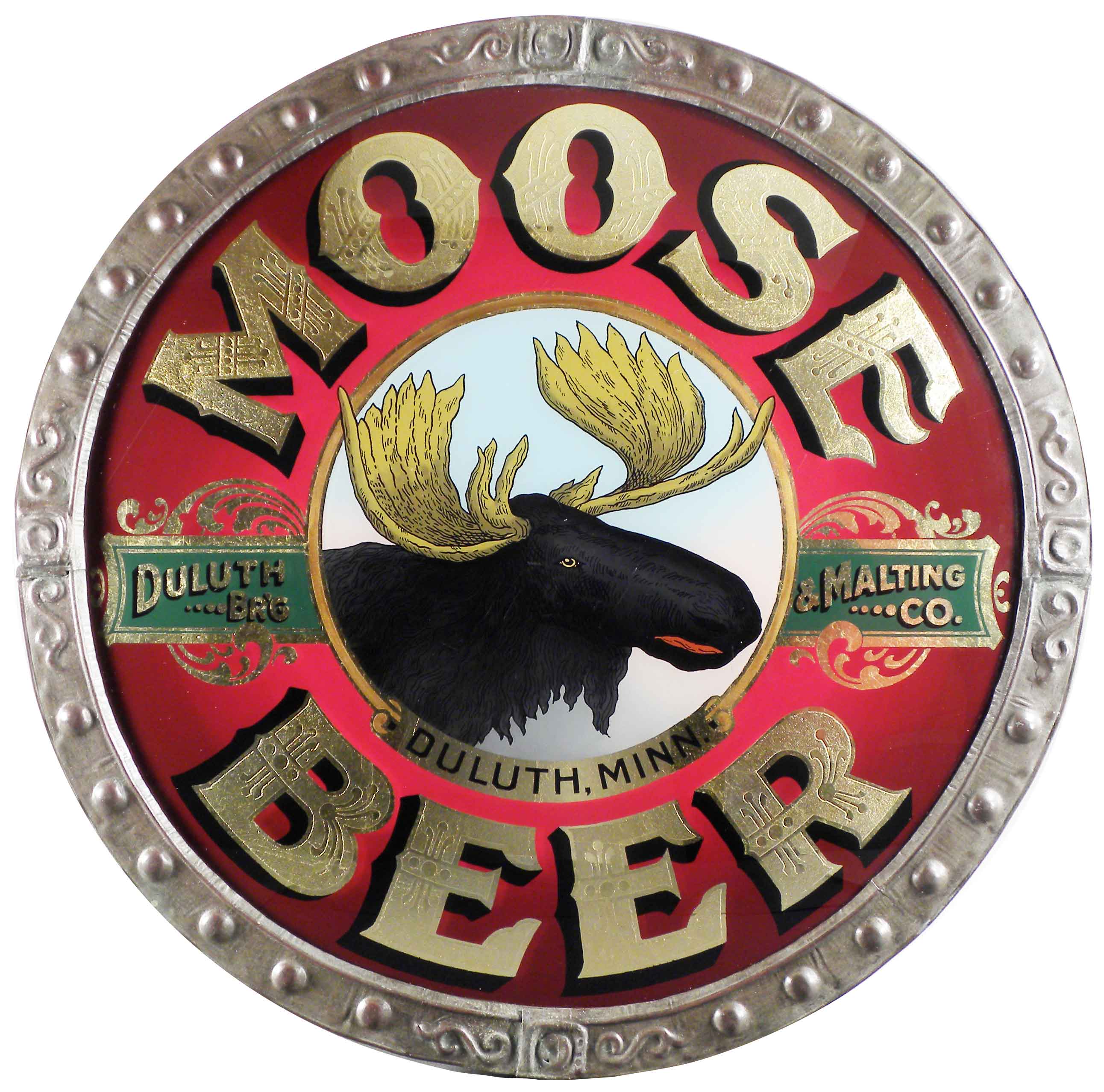 Moose Beer Reverse Glass Sign. Duluth & Malting Brewing Co. Duluth, Minn. Come in original metal with corner mount frame. Near mint condition. 19 1/2 inch diameter X 3 inches deep.