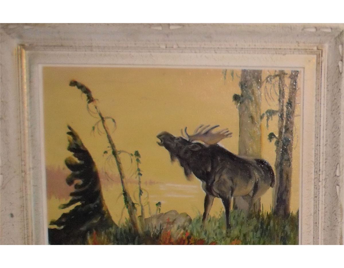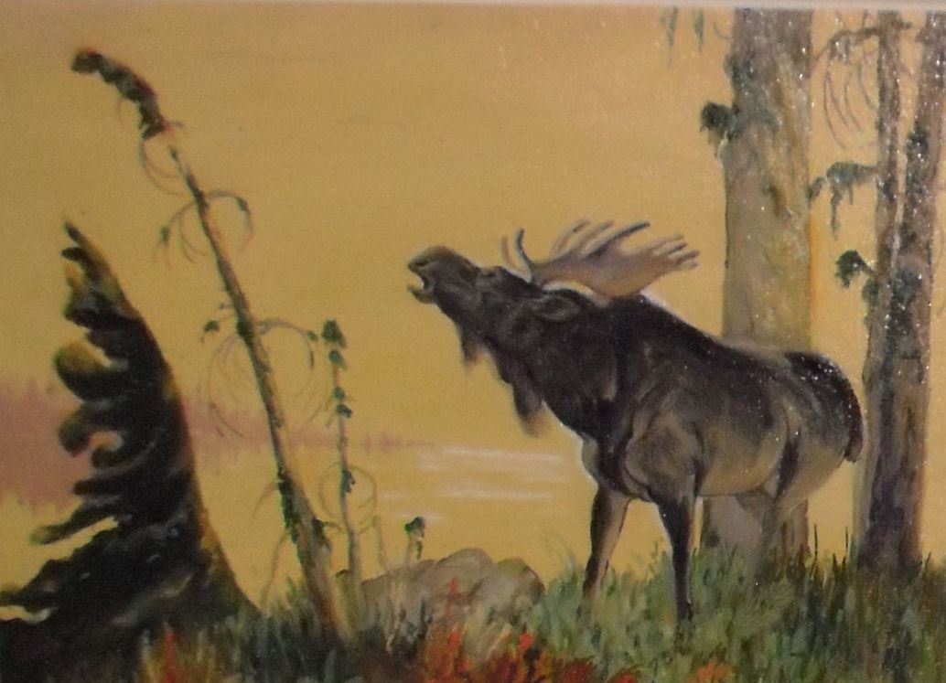 "Moose Call" indeed you seem to hear it as created on canvas by an expert artist painter: Jessie D Monkman; old oil original creation about 16 high x 20 inches as an impressive engaging scene like an outdoor one in the hunting season mate moose male call; plus wood frame if you want that too !