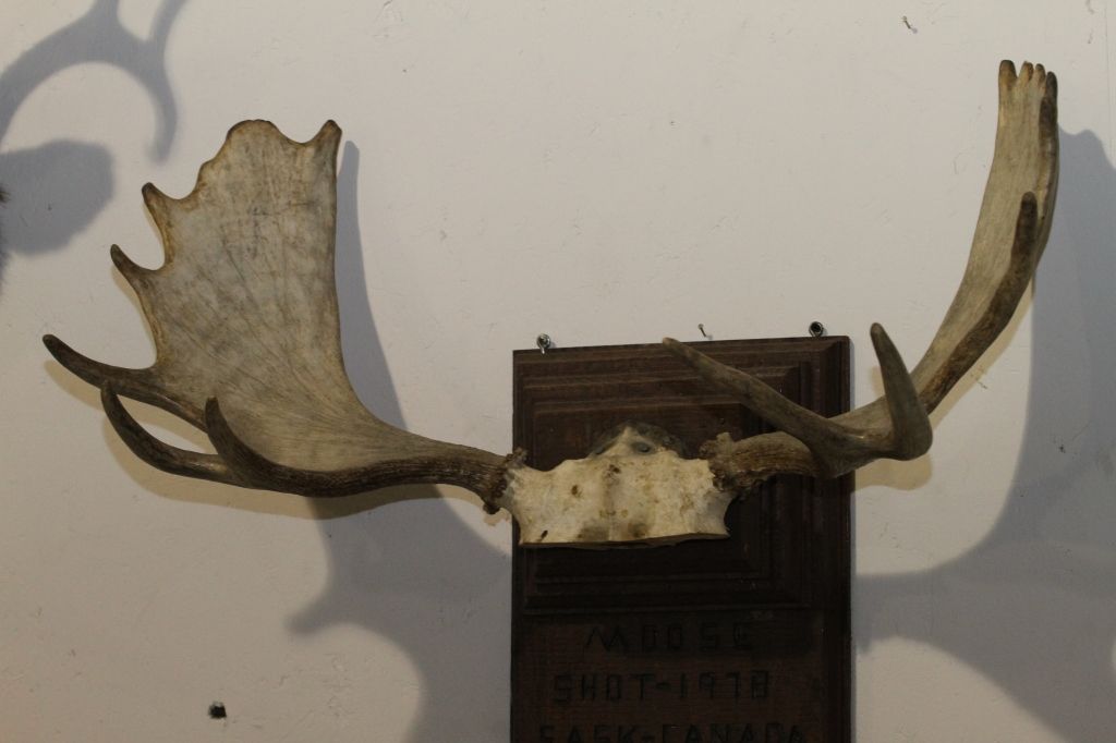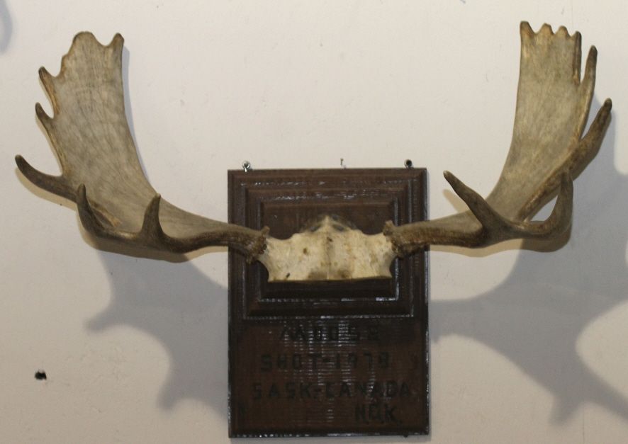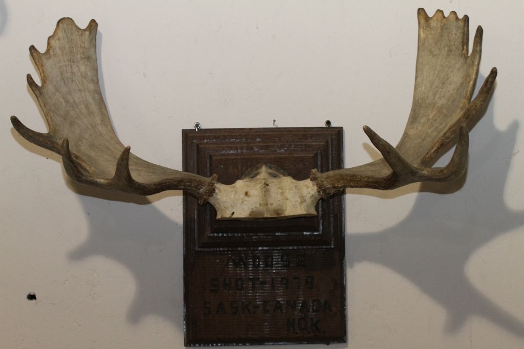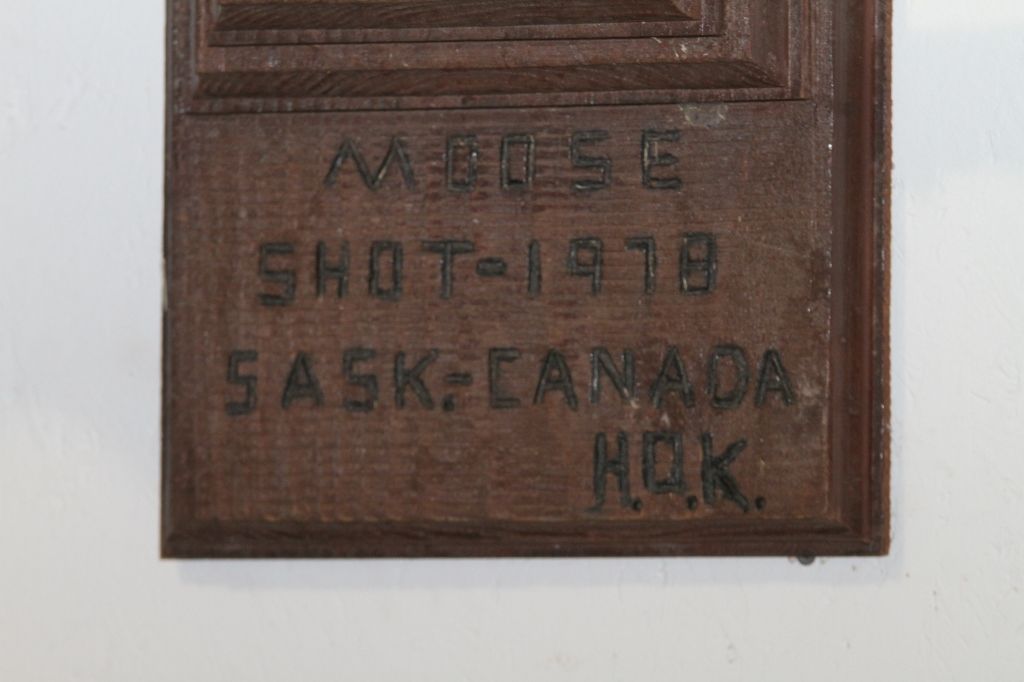 Moose Rack Shot 1978 Moose Rack mounted on wood reads, "Moose Shot 1978 Sask-Canada H.O.K."