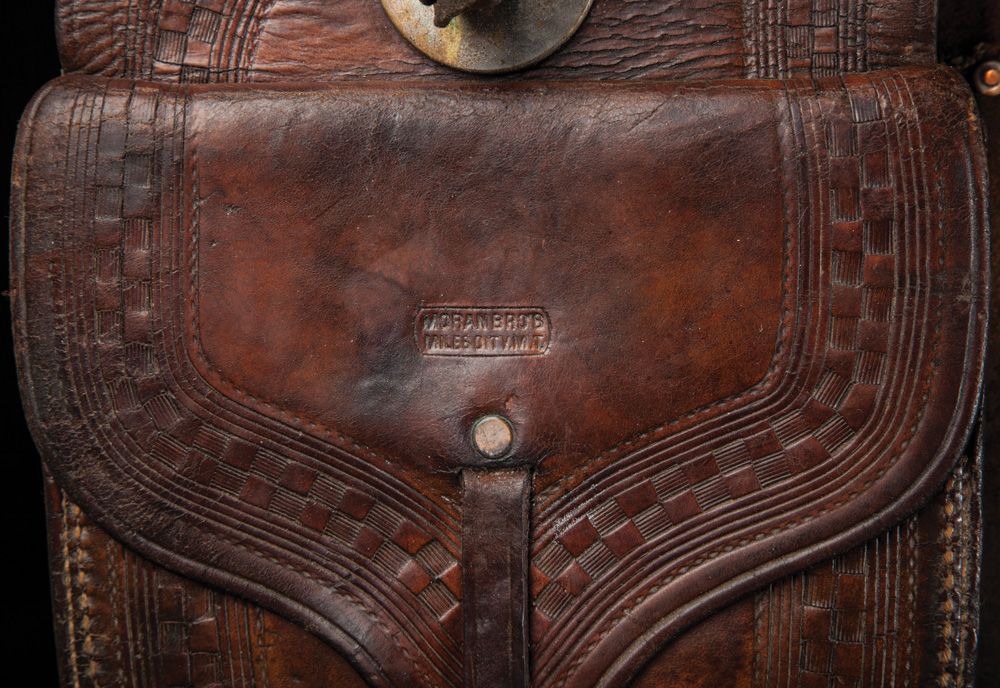 Moran Bros. Miles City, Montana Territory Saddle Pockets. Montana Territory Saddle Pockets, covers are both marked ‘Moran Bros Miles City M.T., basket weave borders, 7 ½ x 7 inch pockets, oval German silver buckles, 2 sets of saddle string holes, 1 ¾ inch conchos. Heavy leather is very good, seams are sound, bellows are still good, right side maker’s mark is worn.