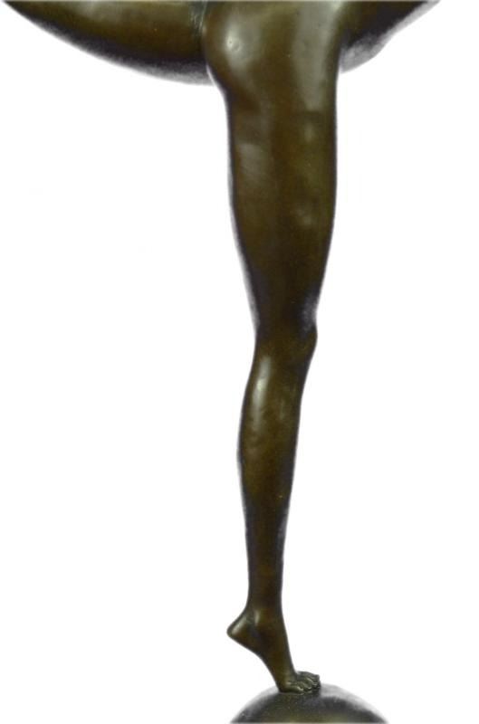 With ease, she extends her back leg out and her arm out to her side while balancing on one foot. She holds a hoop with her lifted a foot and her hand, she performs her dance with ease and confidence letting us know she is a disciplined dancer. She wears a feathered headdress that also has a fan-like piece with intricate designs on it. She has soft facial features and her body is lean and long. Her headpiece frames her face and follows down to her neck making her face the focal point of the sculpture. This sculpture was cast using the Lost Wax Method and has a brown patina and is mounted on a marble base. Dimensions: Height 26 X Width 11 inches. Weight: 15 LBS.
