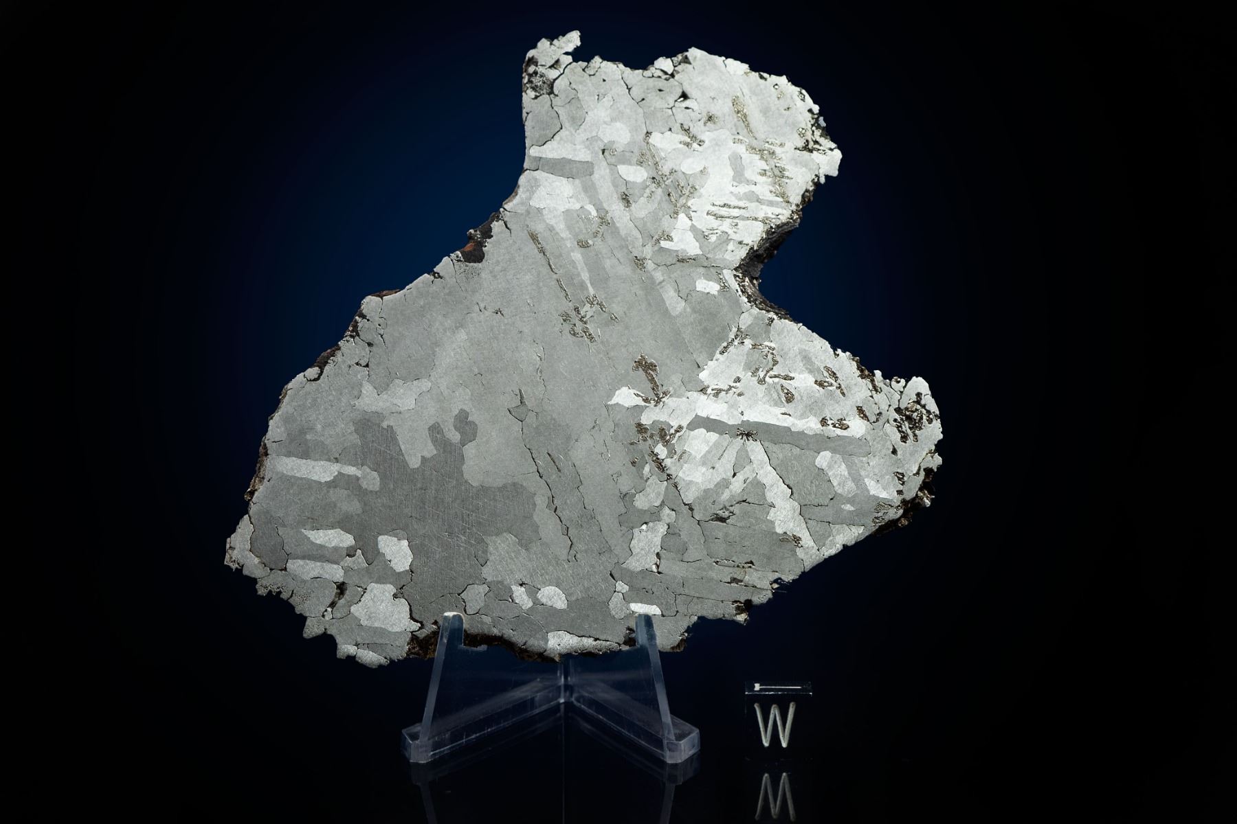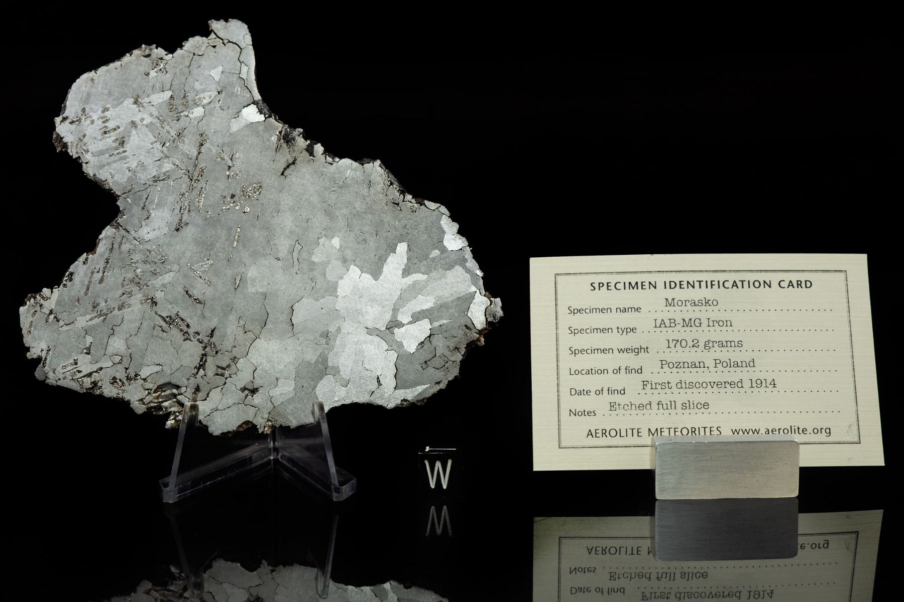 Desirable Morasko meteorite slice, etched and polished on both faces. The full slice weighs 170.2 grams and measures approximately 120 mm x 100 mm x 3 mm. Morasko is associated with the mysterious and alluring field of impact features in Poland, near the city of Poznan. The site is protected and some of the larger craters, lying deep in lush woodland, are filled with water and green algae giving them an otherworldly feel. An episode of the multi award-winning TV series Meteorite Men was filmed at Morasko in 2011, and Geoff and his co-host, Steve, discovered a 75-lb complete iron which was, at the time, the second-largest meteorite ever found in Poland (and the most deeply buried). Morasko irons are very rarely seen on the collectors’ market and this fine, full slice was prepared by an expert iron meteorite cutter and shows a lovely etch. Note the arresting, angular shape and crisscrossing schriebersite inclusions. The Morasko craters lie in a battlefield that saw multiple conflicts during WWI, WWII, and the Napoleonic era. A real prize for collectors of crater-forming meteorites. Accompanied by a certificate of authenticity signed by Geoff Notkin of Aerolite Meteorites Inc. and the TV show Meteorite Men, as well as a specimen identification card.
