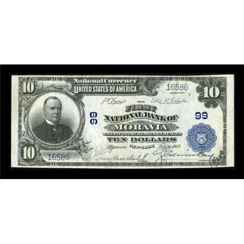 <B>Moravia, NY</B></I> - $10 1902 Plain Back Fr. 624 <B>The First NB</B></I> Ch. # 99<BR> This is a note with a distinguished pedigree, as it comes from Lester Merkin's 1973 sale of M.O. Warns' first hundred charter collection, where it was lot 72. Pleasing <B>Very Fine+,</B></I> with clear signatures. <BR><BR><b>Shipping:</b> Coins & Currency (<a target="_blank" href="http://www.heritageauctions.com/common/shipping.php">view shipping information</a>)