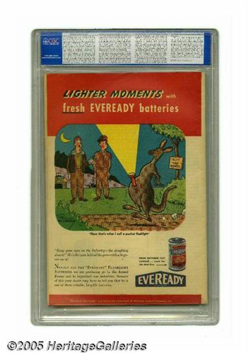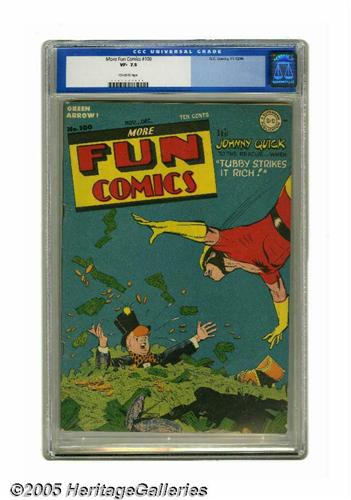 <B>More Fun Comics #100 (DC, 1944) CGC VF- 7.5 Off-white pages.</B></I> Since when does a guy swimming in money need rescuing? At any rate, Johnny Quick is taking care of it (he can fly, don't forget). The cover is by Mort Meskin, who also drew Johnny's story inside the book. Also appearing are the Spectre (with Bernard Baily art), Green Arrow, and Aquaman. Overstreet 2005 VF 8.0 value = $756. CGC census 1/05: 4 in 7.5, 5 higher. <I>From the Northern Lights Collection.</B></I>