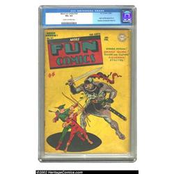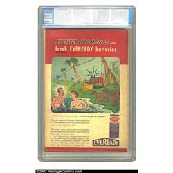 More Fun Comics #101 (DC, 1945) CGC VG+ 4.5 Cream to off-white pages. This issue was marked by two milestones. One, the origin and first appearance of Superboy, is one of the major DC events of the period, making this a very key issue. The other event worth mentioning is the last appearance of Spectre in the title. Like many issues of this title, this is a Gerber "uncommon" book, so even solid mid-grades like this aren't that easy to find. Overstreet 2002 GD 2.0 value = $769; FN 6.0 value = $2,307. Important notice: We expect to be auctioning lots at the rate of 200-250 per hour. Sometimes eBay Premier live bid software cannot keep up with that pace, so we strongly recommend that you place a realistic proxy bid now as insurance to avoid disappointment. Also please note that all Heritage/CAA lots purchased through eBay Premier carry a 20% Buyer's Premium. Please make sure you read the Terms and Conditions.