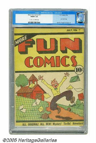 <B>More Fun Comics #11 (DC, 1936) CGC FN/VF 7.0 Cream to off-white pages.</B></I> Issue rated "rare" by Gerber, and CGC has certified a higher grade (7.5) for just one copy to date. Vincent Sullivan is the cover artist, and also contributed interior art along with Joe Shuster, Leo O'Mealia, and Creig Flessel. Overstreet 2005 FN 6.0 value = $1,635; VF 8.0 value = $3,900. CGC census 1/05: 1 in 7.0, 1 higher. <I>From the Northern Lights Collection</B></I>.