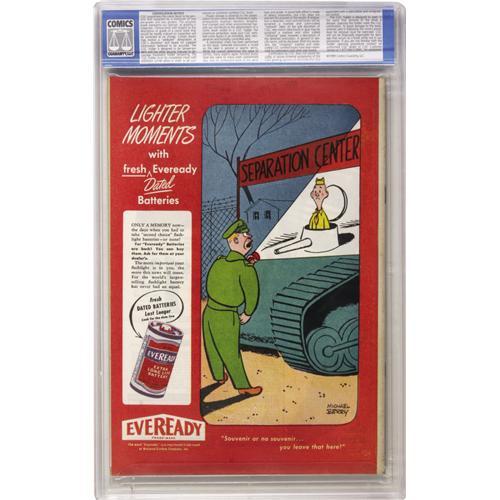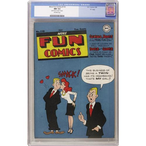 <B>More Fun Comics #110 "D" Copy pedigree (DC, 1946) CGC NM 9.4 Off-white pages.</B></I> The highest graded copy of this issue certified by CGC to date, and the first one we've had the privilege to offer. CGC notes, "Light foxing on edges of pages." Overstreet 2006 NM- 9.2 value = $275. CGC census 10/06: 1 in 9.4, none higher.<BR><BR><b>Shipping:</b> Slabbed Comic (<a target="_blank" href="http://www.heritageauctions.com/common/shipping.php">view shipping information</a>)