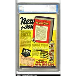 More Fun Comics #112 (DC, 1946). One of the scarce later issues of this highly-collectible title. Strongly appealing, this book looks nicer than the grade would indicate. CGC notes, "Small "M F" stamp on centerfold". CGC VF- 7.5 Cream to off-white pages. Overstreet 2001 FN 6.0 value = $66; NM 9.4 value = $175.  Important notice: We expect to be auctioning lots at the rate of 200-250 per hour. Sometimes eBay Premier live bid software cannot keep up with that pace, so we strongly recommend that you place a realistic proxy bid now as insurance to avoid disappointment. Also please note that all Heritage/CAA lots purchased through eBay Premier carry a 20% Buyer's Premium.