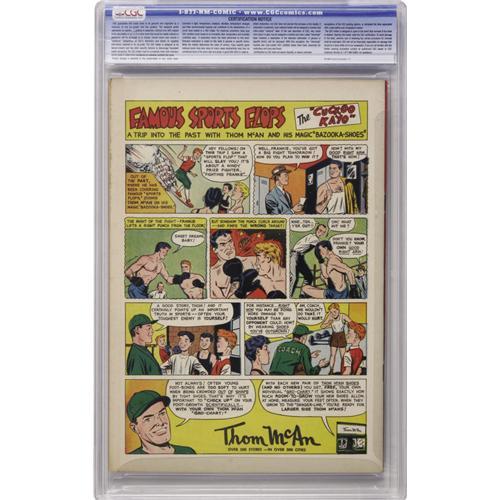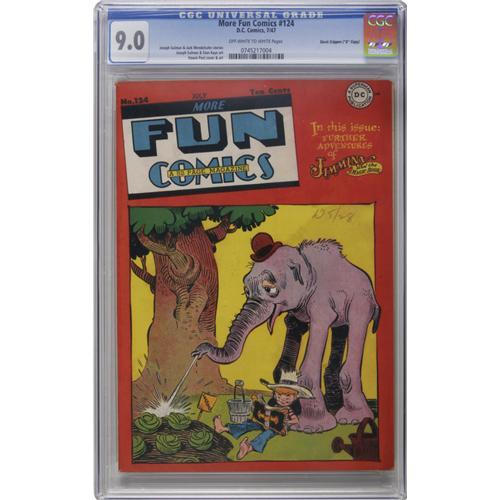 <B>More Fun Comics #124 Davis Crippen ("D" Copy) pedigree (DC, 1947) CGC VF/NM 9.0 Off-white to white pages.</B></I> We think DC collectors will agree that this issue's Guide value doesn't reflect the scarcity of the book. This is the only copy CGC has certified to date! By this point in the run, the superheroes were long gone; Genius Jones and Dover and Clover are the most recognizable characters. The cover is by Howie Post. Overstreet 2006 VF/NM 9.0 value = $189; NM- 9.2 value = $250. CGC census 9/06: 1 in 9.0, none higher. <I>From the Crippen Collection</B></I>.s<BR><BR><b>Shipping:</b> Slabbed Comic (<a target="_blank" href="http://www.heritageauctions.com/common/shipping.php">view shipping information</a>)