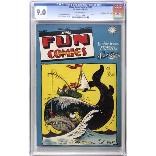 <B>More Fun Comics #127 Davis Crippen ("D" Copy) pedigree (DC, 1947) CGC VF/NM 9.0 Off-white pages.</B></I> It's the last issue of DC's first-ever comic series (which had a name change from <B>New Fun Comics</B></I> along the way). This final issue is called "scarce" by both Overstreet and Gerber. The issue has cover and interior art by Howie Post. Overstreet 2006 VF/NM 9.0 value = $320; NM- 9.2 value = $425. CGC census 9/06: 1 in 9.0, 1 higher. <I>From the Crippen Collection</B></I>.<BR><BR><b>Shipping:</b> Slabbed Comic (<a target="_blank" href="http://www.heritageauctions.com/common/shipping.php">view shipping information</a>)