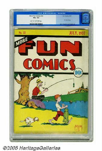 <B>More Fun Comics #22 (DC 1937) CGC VG+ 4.5 Light tan to off-white pages.</B></I> DC's oldest comic series was its flagship long before <B>Action Comics</B></I> #1 signaled the dawn of the Golden Age of Comics. Some of the most influential scripters and artists of comics' early days contributed to this issue, including Creig Flessel, Vincent Sullivan, Jerry Siegel, Joe Shuster, and Leo O'Mealia. Just two copies of this Gerber "scarce" issue have been certified by CGC to date, with the highest grade earned thus far a modest FN 6.0. Overstreet 2005 VG 4.0 value = $552; FN 6.0 value = $828. CGC census 1/05: 1 in 4.5, 1 higher. <I>From the Northern Lights Collection</B></I>.