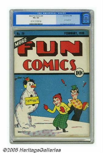 <B>More Fun Comics #29 (DC, 1938) CGC VG+ 4.5 Light tan to off-white pages.</B></I> Dr. Occult story by Jerry Siegel and Joe Shuster. Vincent Sullivan cover and art. Overstreet 2005 VG 4.0 value = $500. CGC census 1/05: 2 in 4.5, 3 higher. <I>From the Northern Lights Collection</B></I>.