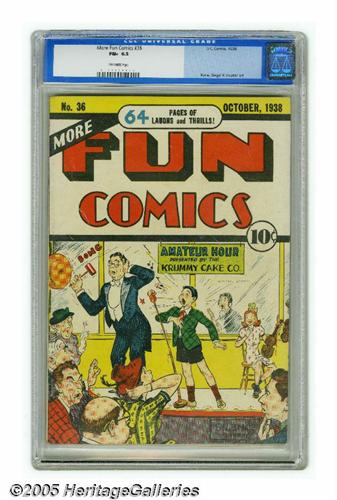 <B>More Fun Comics #36 (DC, 1938) CGC FN+ 6.5 Off-white pages.</B></I> Creig Flessel cover, with Bob Kane, Joe Shuster, and Bernard Baily art. Overstreet 2005 FN 6.0 value = $750; VF 8.0 value = $1,375. CGC census 1/05: 1 in 6.5, 1 higher. <I>From the Northern Lights Collection</B></I>.