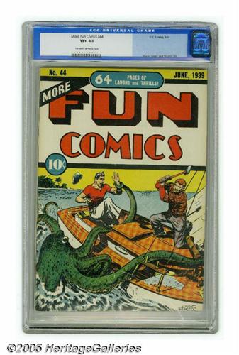 <B>More Fun Comics #44 (DC, 1939) CGC VF+ 8.5 Cream to off-white pages.</B></I> Creig Flessel cover. Bob Kane, Bernard Baily, and Joe Shuster art. Overstreet 2005 VF 8.0 value = $1,166; VF/NM 9.0 value = $1,583. CGC census 1/05: 1 in 8.5, 1 higher. <I>From the Northern Lights Collection</B></I>.