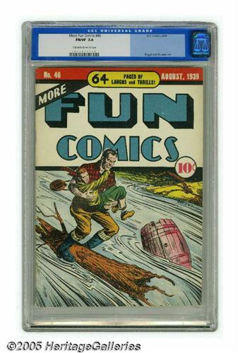 <B>More Fun Comics #46 (DC, 1939) CGC FN/VF 7.0 Cream to off-white pages.</B></I> DC's oldest comic series is a daunting challenge to complete, but these offerings can help you get started or even help complete your run. Creig Flessel cover. Joe Shuster and Bernard Baily art. Overstreet 2005 FN 6.0 value = $636; VF 8.0 value = $1,166. CGC census 1/05: 2 in 7.0, 5 higher. <I>From the Northern Lights Collection</B></I>.
