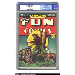More Fun Comics #51 Larson pedigree (DC, 1940) CGC VF/NM 9.0 White pages. This final pre-hero issue of the series introduced the Spectre in the last panel of the Buccaneer story, before he went on to his first full appearance in the next issue. Shelly Moldoff did a great job creating the cover, which features a woodsman warding off a pack of vicious wolves. According to CGC, there's only one other copy out there as nice as this one, and that's the Mile High. Clean, crisp and sharp, this is a beautiful copy of a classic comic, and worthy of an honored place in any collection. Overstreet 2002 NM 9.4 value = $6,300. Important notice: We expect to be auctioning lots at the rate of 200-250 per hour. Sometimes eBay Premier live bid software cannot keep up with that pace, so we strongly recommend that you place a realistic proxy bid now as insurance to avoid disappointment. Also please note that all Heritage/CAA lots purchased through eBay Premier carry a 20% Buyer's Premium. Please make sure you read the Terms and Conditions.