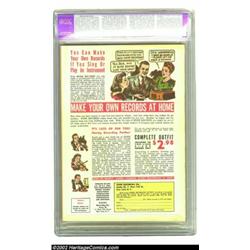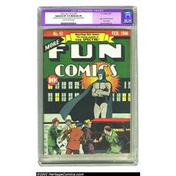 More Fun Comics #52 (DC, 1940) Apparent VF 8.0 Moderate (P) Cream to off-white pages. Currently holding down tenth place on Overstreet's "Top 100 Golden Age Comics", this issue places so high primarily because featured herein is the origin and first appearance of the Spectre. But it's also a "scarce to rare" issue, according to Overstreet. Gerber agrees, calling it "rare" which in his scarcity indexing system means there's only 11 to 20 copies in existence. CGC has certified four unrestored copies of issue #52, only one of which could score higher than Good/Very Good grading. In its pre-professional restoration days, this copy would probably have ranked as the third-nicest unrestored copy to be seen by CGC. Now, it looks much nicer than all but one unrestored copy, and most likely will be available at a relatively economical price. Of the restoration, CGC notes "Restoration includes color touch, pieces added, tear seals, cleaned, reinforced." Bernard Baily, responsible for this cover, co-created his most famous subject with Jerry Siegel, who also co-created Superman. Overstreet 2002 VF 8.0 value = $36,000. Important notice: We expect to be auctioning lots at the rate of 200-250 per hour. Sometimes eBay Premier live bid software cannot keep up with that pace, so we strongly recommend that you place a realistic proxy bid now as insurance to avoid disappointment. Also please note that all Heritage/CAA lots purchased through eBay Premier carry a 20% Buyer's Premium. Please make sure you read the Terms and Conditions.