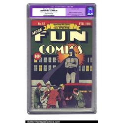 More Fun Comics #52 (DC, 1940) CGC Apparent FN+ 6.5 Slight (P) Cream to off-white pages. After running 51 issues, it was decided that DC's first published title should house a new superhero, following tradition with its counterparts Action and Detective. And so the Spectre was born! Part I of his origin was revealed this issue, and continued in #53. This copy is practically unrestored, having only a small amount of glue on the spine of the cover. The appearance is that of a VF copy, with slight skimming along the spine and a loose top staple accounting for the FN+ grade. A very attractive book. Overstreet 2002 FN 6.0 value = $15,940. Important notice: We expect to be auctioning lots at the rate of 200-250 per hour. Sometimes eBay Premier live bid software cannot keep up with that pace, so we strongly recommend that you place a realistic proxy bid now as insurance to avoid disappointment. Also please note that all Heritage/CAA lots purchased through eBay Premier carry a 20% Buyer's Premium. Please make sure you read the Terms and Conditions.