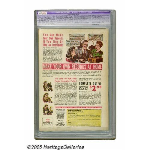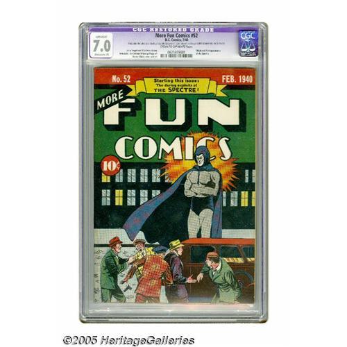 <B>More Fun Comics #52 (DC, 1940) CGC Apparent FN/VF 7.0 Moderate (P) Cream to off-white pages.</B></I> This book contains the origin and first appearance of the Spectre, who is in costume in the first splash panel. Spectre cover by Bernard Baily. Stories by Jerry Siegel and Al Sulman, with interior art by Baily, John Lehti, Joe Sulman, and George Papp. CGC notes, ""Restoration includes: color touch, pieces added, tear seals, cover cleaned, reinforced. (Wrong married back cover)"" Overstreet 2005 GD 2.0 value = $5,350; VG 4.0 value = $10,700; FN 6.0 value = $16,050; VF 8.0 value = $40,400. <BR><BR><B>Important notice:</B> Heritage usually auctions material at the rate of 200-250 lots per hour. On some occasions eBay Live bid software or the Internet may not be able to keep up with the pace of the auction. We recommend placing a realistic absentee bid now as insurance to avoid disappointment. Occasionally the auctioneer may eliminate or reject an eBay Live bid, and the auctioneer may also reopen a lot after the close of the eBay live bidding (usually because we missed an audience bid), and may reject your bid even if it shows you as the winning bidder. By bidding via eBay Live, you agree that Heritage may award the lot to another bidder at its sole discretion under the circumstances described above or any other reasonable circumstances. Since eBay bids are not shown to us until we open the lot on the floor, we treat those bids just like floor bids. In most cases the floor responds before the eBay bid is presented to us, due to Internet lag time, so for consistency we have made it a policy that floor bids are always considered first over tie eBay live bids. Also please note that all Heritage lots purchased through eBay Live carry a 20% Buyer's Premium. Please make sure you read the Terms and Conditions before you bid. This lot is being auctioned in conjunction with a live floor auction by Heritage Galleries & Auctioneers. All final auction and invoice information will