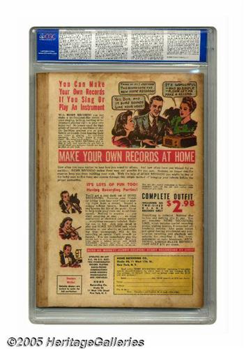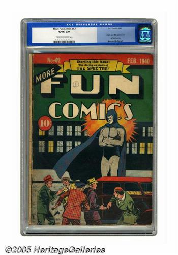 <B>More Fun Comics #52 (DC, 1940) CGC GD/VG 3.0 Cream to off-white pages.</B></I> This issue, the origin and first appearance of the Spectre, is on Overstreet's list of the ten most valuable comic books, and it was quite a special day when we laid eyes on this unrestored copy. The eerie superhero had a bluish-gray cape in his very first appearance; he would have a green cowl in the next issue and forever after. The character, writer Jerry Siegel's follow-up to Superman, has been an enduring figure throughout the history of DC, with every generation of comic fans getting to know him, both as a member of the Justice Society and as star of his own title several times in decades to come. The book's cover and interior art are by the artist most associated with the character, Bernard Baily. Gerber's <B>Photo-Journal</B></I> gives this comic a scarcity rating of "8," and CGC's census bears out everything we've heard about the scarcity of the book. Only two unrestored copies have been certified with higher grades by CGC to date. Overstreet 2005 GD 2.0 value = $5,350; VG 4.0 value = $10,700. CGC census 4/05: 1 in 3.0, 2 higher.<I>From the Northern Lights Collection.</B></I>