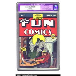 More Fun Comics #53 (DC, 1940) CGC Apparent VF+ 8.5 Slight (P) Off-white pages. Part II of the Spectre's origin is told in this issue, continued from #52. The Spectre, an extremely powerful hero created by Bernard Baily, enjoyed a healthy run in More Fun until he vacated the series after the introduction of Superboy in #101. This copy has a beautiful appearance, exhibiting rounded corners and paper skimming along the spine. A small amount of glue on the spine is the only reason why this book has a purple label. Overstreet 2002 VF 8.0 value = $16,800. Important notice: We expect to be auctioning lots at the rate of 200-250 per hour. Sometimes eBay Premier live bid software cannot keep up with that pace, so we strongly recommend that you place a realistic proxy bid now as insurance to avoid disappointment. Also please note that all Heritage/CAA lots purchased through eBay Premier carry a 20% Buyer's Premium. Please make sure you read the Terms and Conditions.