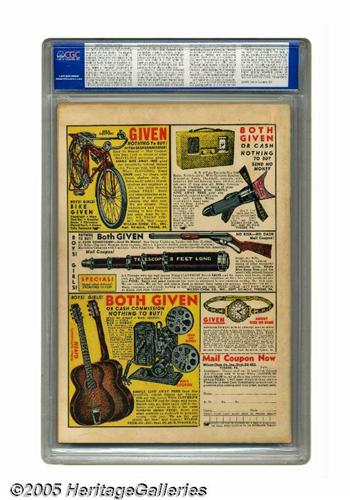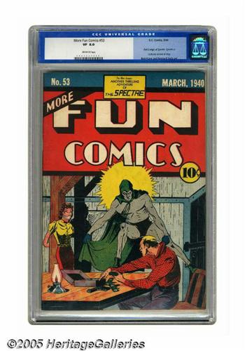 <B>More Fun Comics #53 (DC, 1940) CGC VF 8.0 Off-white pages.</B></I> This issue, the second appearance of the Spectre, is currently #23 in Overstreet's ranking of the most valuable comic books, and the high ranking has to do with the hero's presence as well as the scarcity of the book -- it's a Gerber "8." The Spectre appears in costume on the bondage cover and again at the end of the story, both of which were drawn by Bernard Baily. This book features the start of the Captain Desmo feature (the pilot's previous aerial heroics had been in the pages of <B>Adventure Comics</B></I>) and a host of other stories as well. Overstreet 2005 VF 8.0 value = $18,400. CGC census 4/05: 1 in 8.0, 2 higher. <I>From the Northern Lights Collection.</B></I>