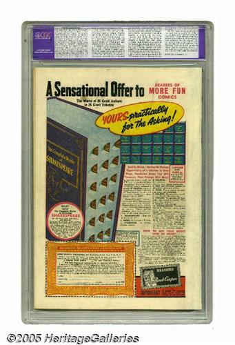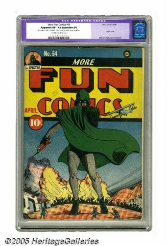<B>More Fun Comics #54 (DC, 1940) CGC Apparent VF- 7.5 Extensive (P) Off-white to white pages.</B></I> Pretty copy of an Overstreet "classic" cover by Bernard Baily. Baily also contributes interior artwork in this issue, as the Spectre makes his third story appearance. CGC notes, "Restoration includes: color touch, pieces added, tear seals, cleaned, re-glossed." Overstreet 2005 GD 2.0 value = $1,118; VG 4.0 value = $2,236; FN 6.0 value = $3,354; VF 8.0 value = $8,385.