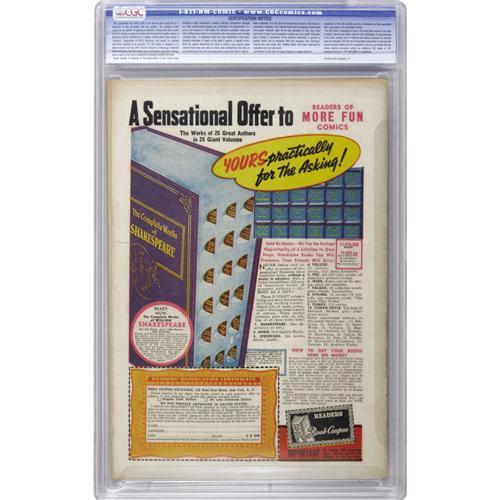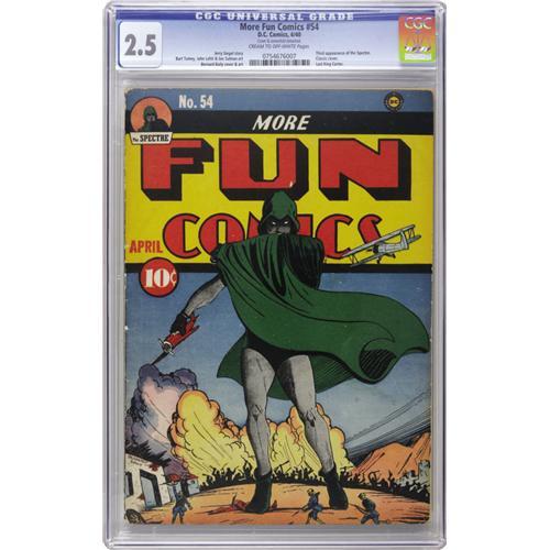 <B>More Fun Comics #54 (DC, 1940) CGC GD+ 2.5 Cream to off-white pages.</B></I> One of Overstreet's 100 most valuable Golden Age books, this one is beloved for its classic Spectre cover by Bernard Baily (it's one of the earliest appearances of the character, who debuted in #52). Gerber calls the book "scarce." If you can get this copy for anywhere near the GD price, consider yourself fortunate. Just have a look at our scan, it doesn't look GD, it looks <I>good</B></I>! CGC notes, "Cover & centerfold detached." Overstreet 2006 GD 2.0 value = $1,167. CGC census 10/06: 2 in 2.5, 9 higher.<BR><BR><b>Shipping:</b> Slabbed Comic (<a target="_blank" href="http://www.heritageauctions.com/common/shipping.php">view shipping information</a>)