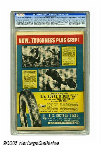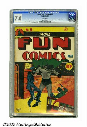 <B>More Fun Comics #55 (DC, 1940) CGC FN/VF 7.0 White pages.</B></I> This "scarce" issue (granted that status by both Gerber and Overstreet) has the first appearance of Doctor Fate of Justice Society fame. And it's also a very early appearance of another future JSAer, the Spectre. Bernard Baily drew the Spectre, while Howard Sherman drew the debut of Dr. Fate. This issue is listed among the 100 most valuable comic books by Overstreet. Overstreet 2005 FN 6.0 value = $3,705; VF 8.0 value = $9,263. CGC census 6/05: 2 in 7.0, 2 higher.